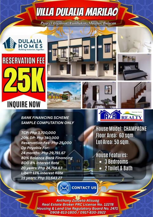 Php 25K Reservation Fee Champagne Model 3BR House And Lot For Sale in Villa Dulalia Marilao Barangay Lambakin, Marilao, Bulacan