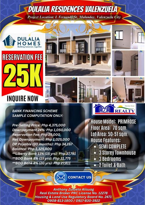 Php 25K Reservation Fee Primrose Model 3BR House And Lot For Sale in Dulalia Residences Valenzuela