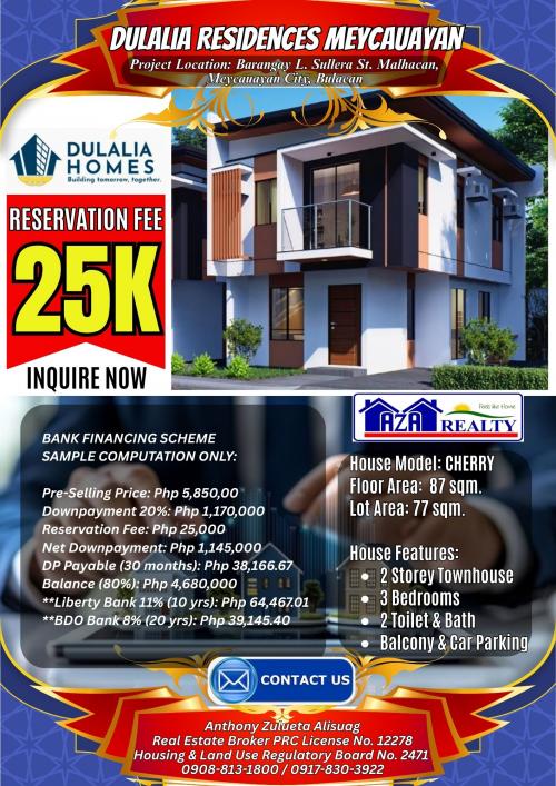 Php 25K Reservation Fee Cherry Model 3BR 2 Storey Single Attached House And Lot For Sale In Dulalia Residences Meycauayan