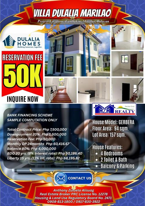 50K Reservation Fee - 4BR Gerbera House & Lot For Sale in Villa Dulalia Marilao