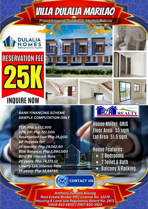 Php 25K Reservation Fee Gris Model 2BR House And Lot For Sale in Villa Dulalia Marilao Barangay Lambakin, Marilao, Bulacan