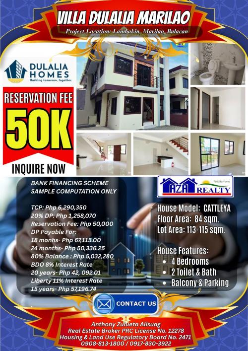 Php 50K Reservation Fee Cattleya Model 4BR House And Lot For Sale in Villa Dulalia Marilao Barangay Lambakin, Marilao, Bulacan