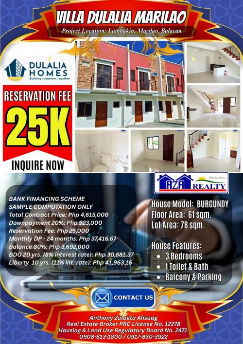 Php 25K Reservation Fee Burgundy Model 3BR House And Lot For Sale in Villa Dulalia Marilao Barangay Lambakin, Marilao, Bulacan