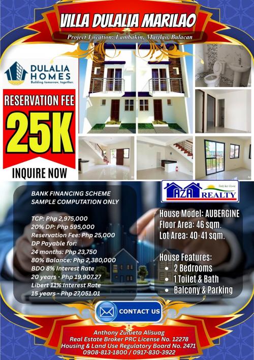 Php 25K Reservation Fee Aubergine Model 2BR House And Lot For Sale in Villa Dulalia Marilao Barangay Lambakin, Marilao, Bulacan