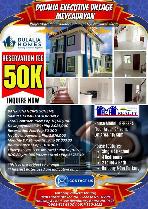50K Reservation Fee Gerbera Model 4BR Single Attached House & Lot For Sale in Dulalia Executive Village Meycauayan