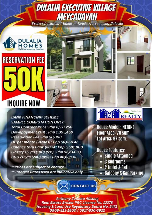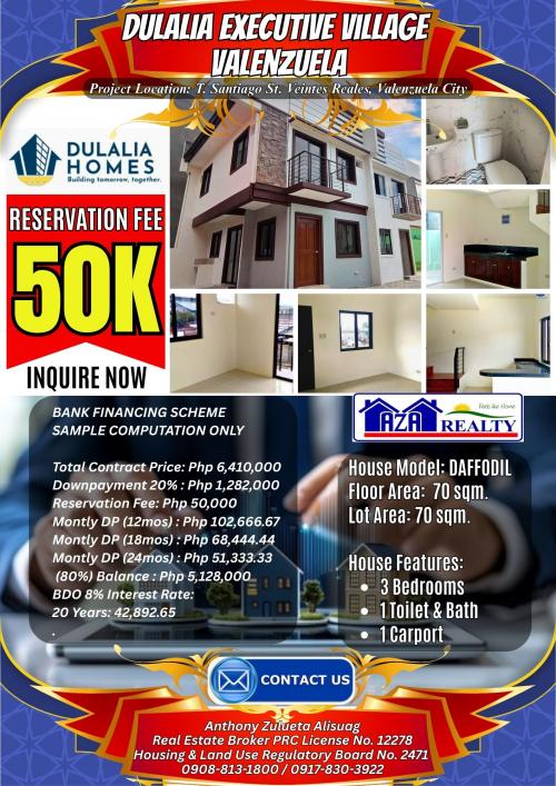 50K Reservation Fee Daffodil Model 3BR Single Attached Dulalia Executive Village Valenzuela