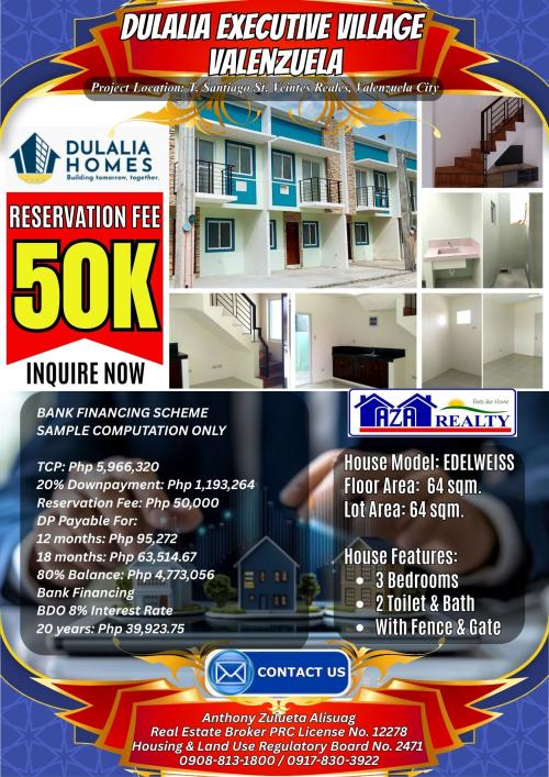 50K Reservation Fee Edelweiss Model House & Lot For Sale in Dulalia Executive Village Valenzuela